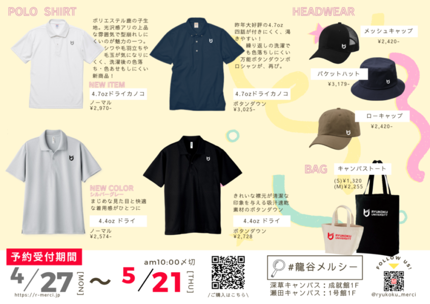 メルシー夏の風物詩!龍谷大学オリジナルポロシャツその他ファッション雑貨のご案内です。