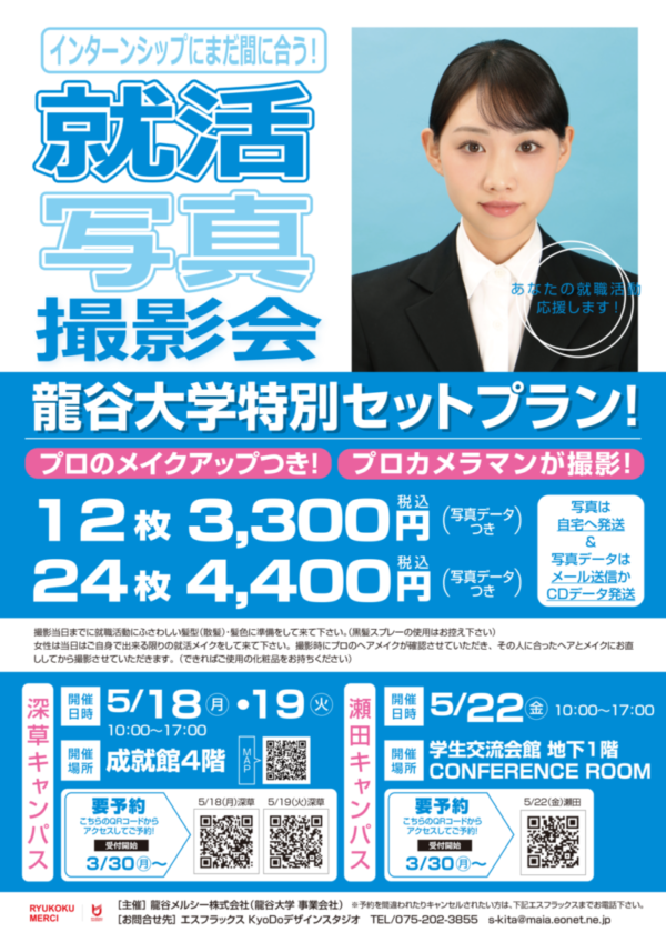 けれど誠意や熱意、なによりあなたの持つ強みを最大限アピールできる“勝負写真”を、龍谷メルシーは全力でサポートします。